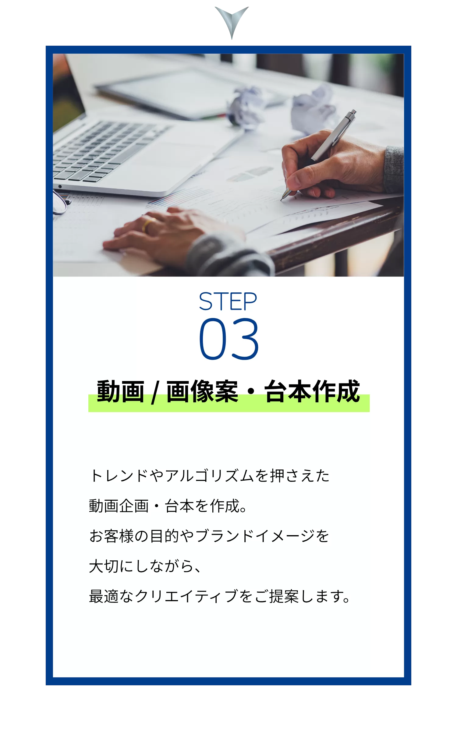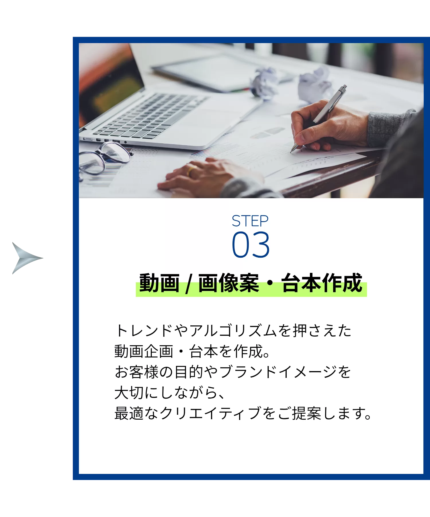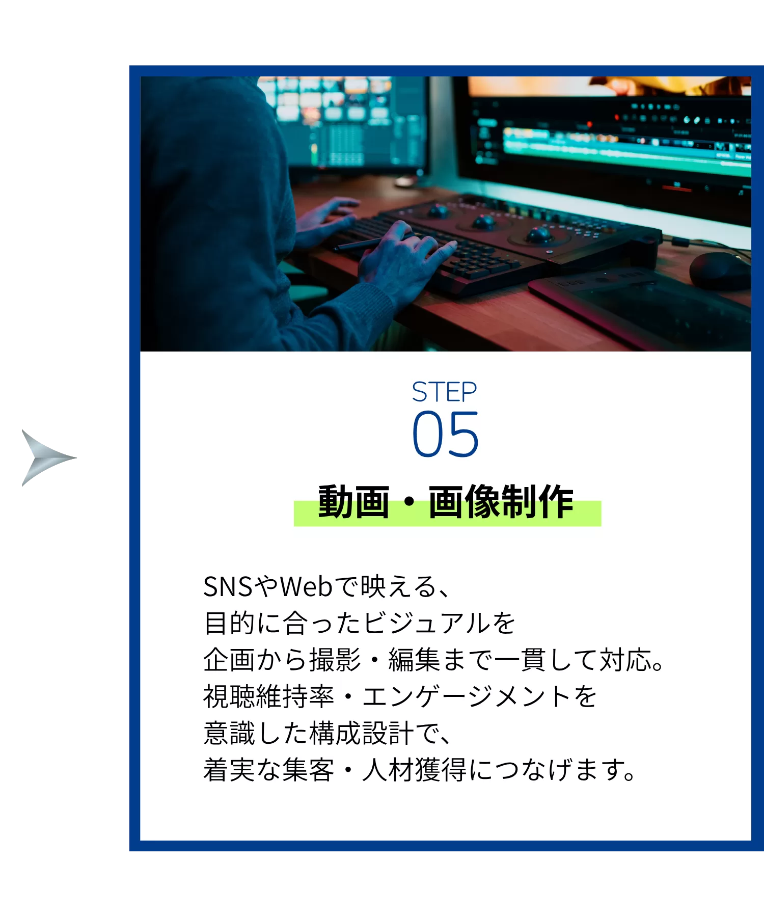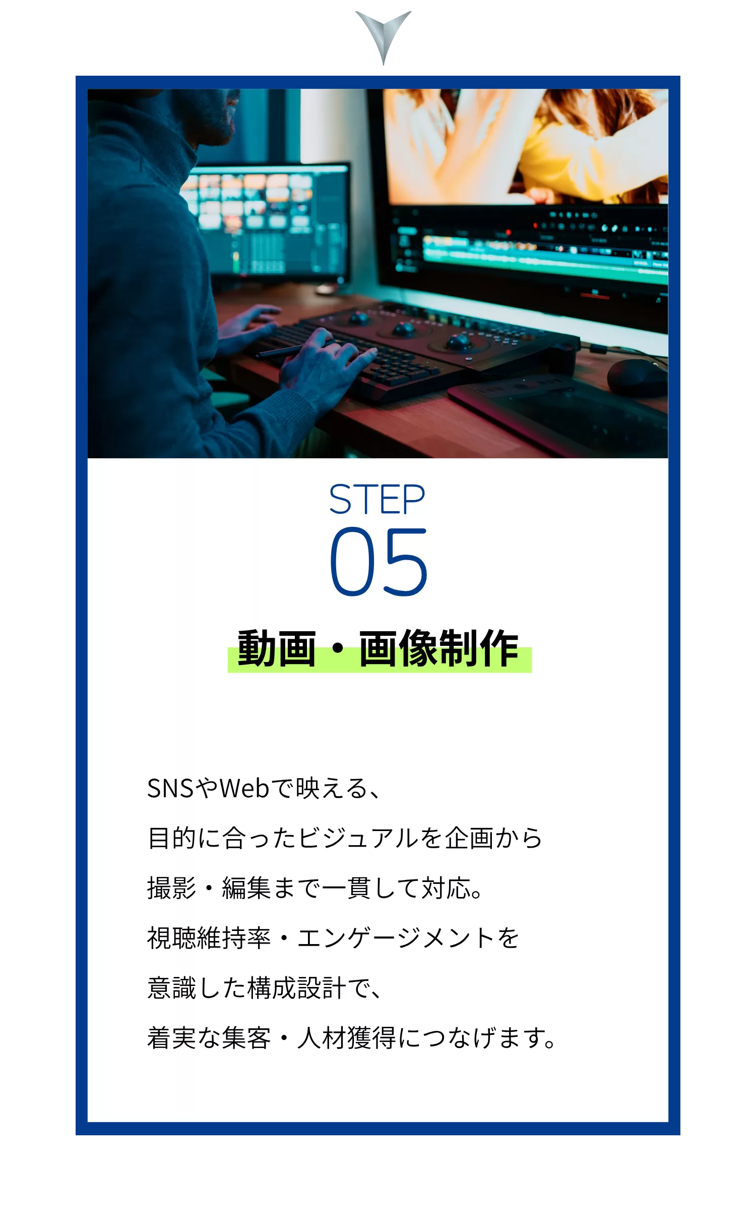 ユーザーの心をつかむ企画・撮影・運用まで一貫してサポートし、貴社の魅力をダイレクトに発信します。