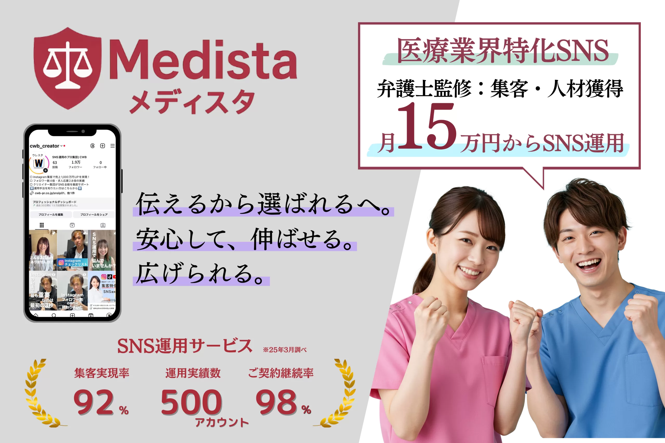 メディスタでは、「誇大表現」や「不適切な広告表現」が、厚生労働省によって厳しく規制されているため、業界初めて弁護士の監修体制を導入しました。