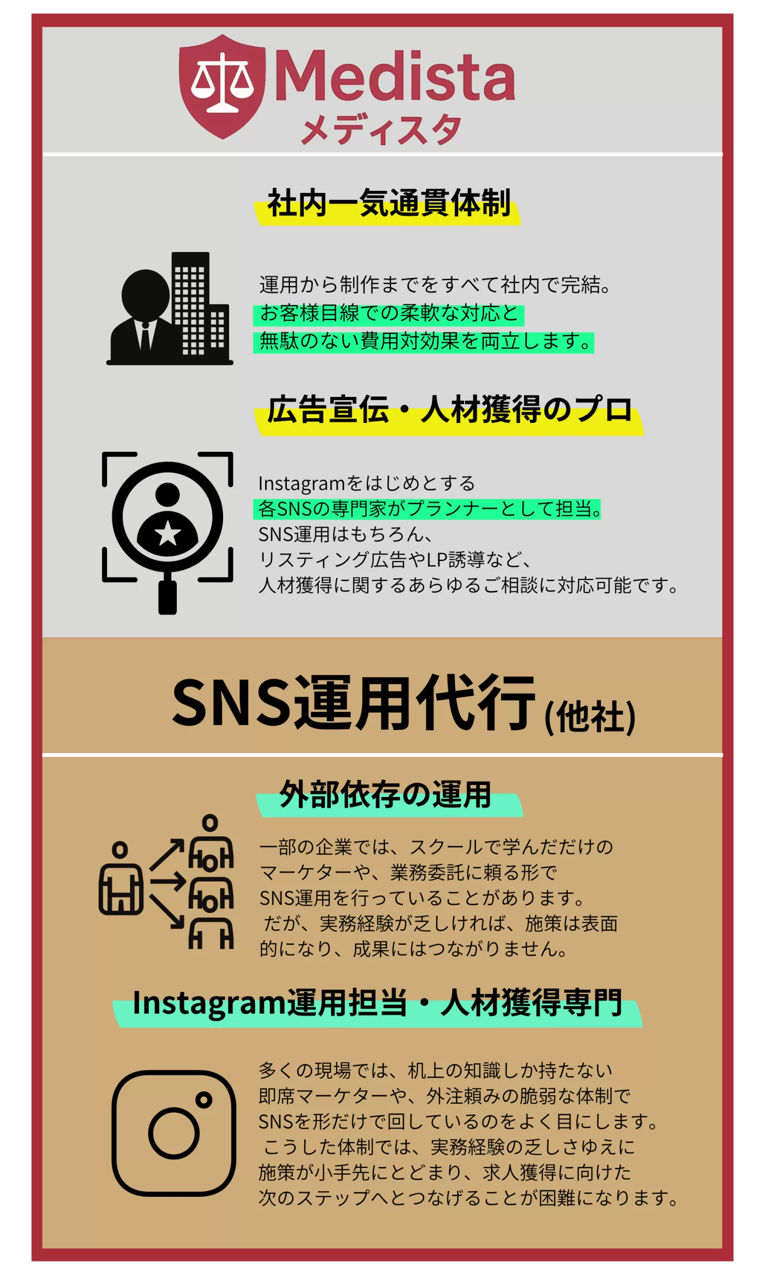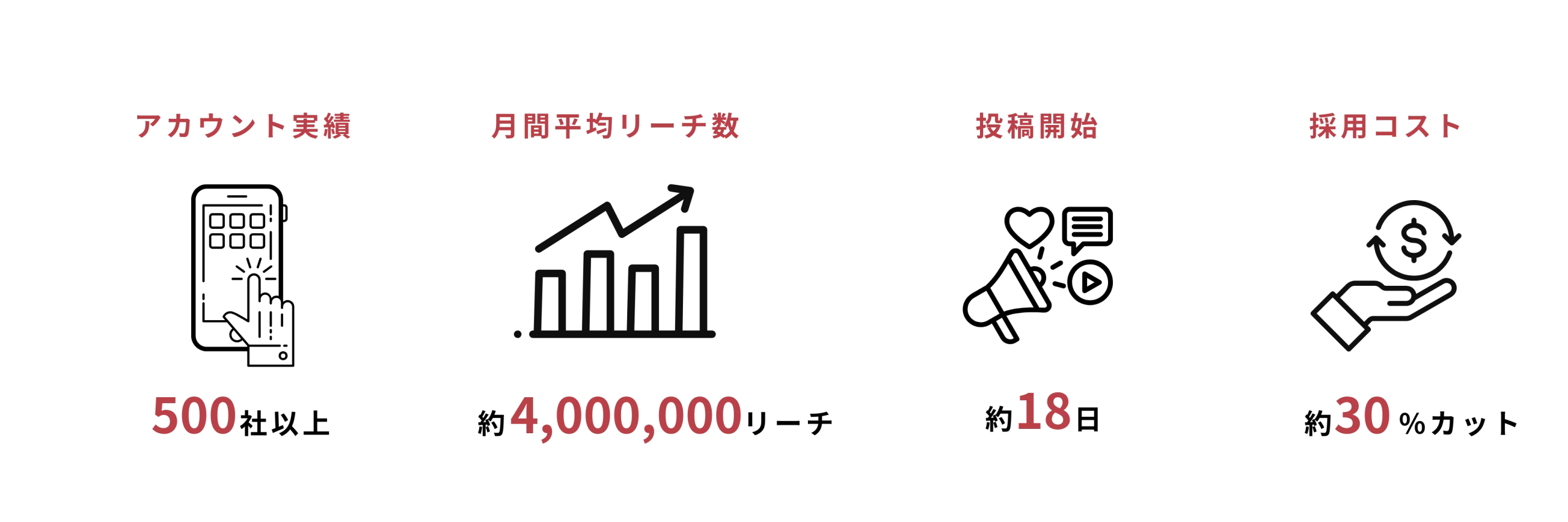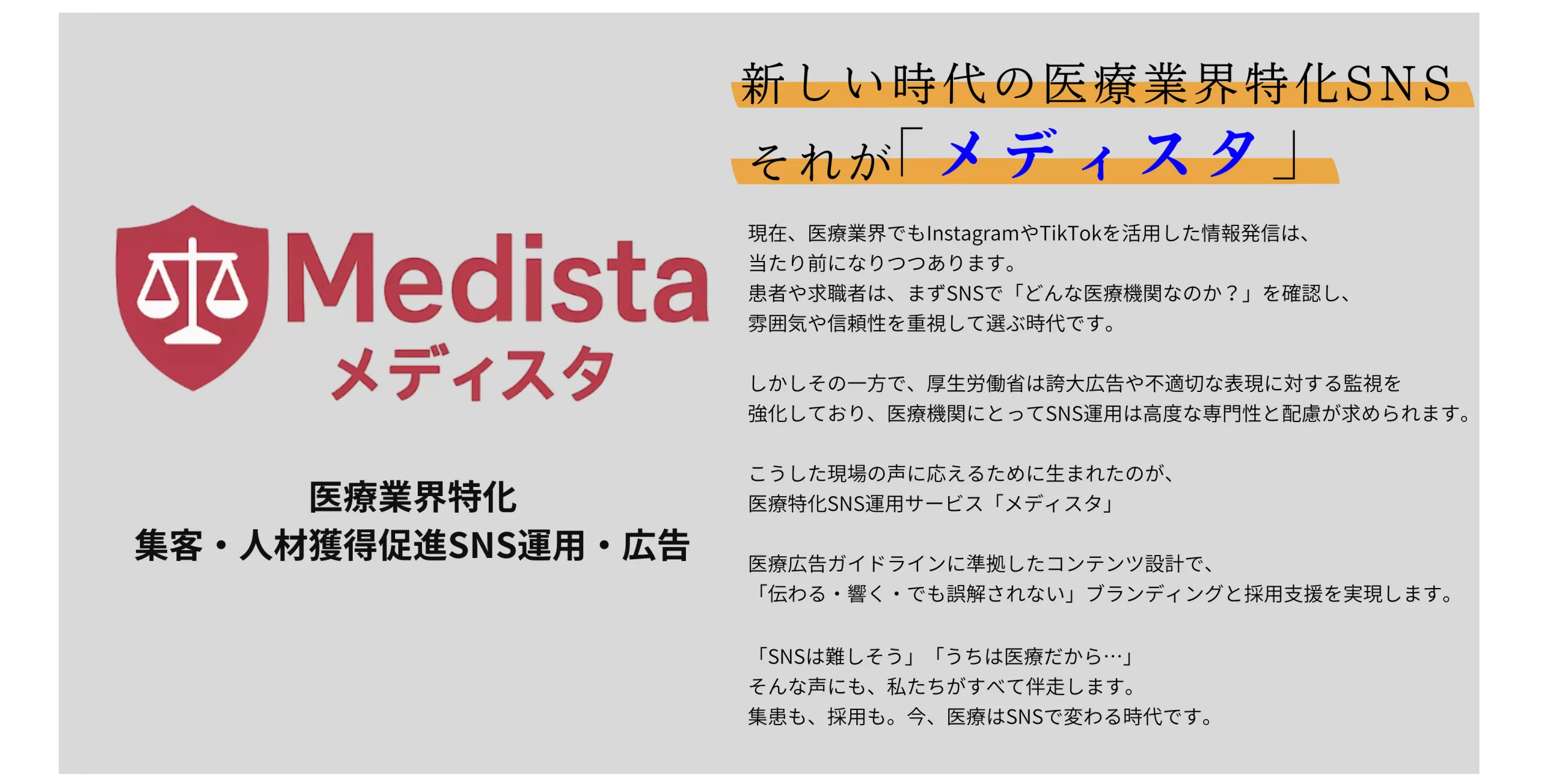 SNS運用の成果を最大化するために、①累計500社以上のアカウント支援実績に基づいたノウハウを活かし、➁最新のトレンドと市場動向を的確に捉えた運用設計により、累計4,000,000リーチを達成。さらに、③貴院の状況を的確に把握し、約18日で投稿を開始。④平均30%の採用コスト削減を実現し、着実な人材獲得・来院促進へとつなげる戦略的サポートを行うSNS運用サービス「メディスタ」をご提供します。