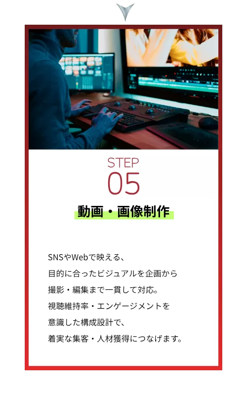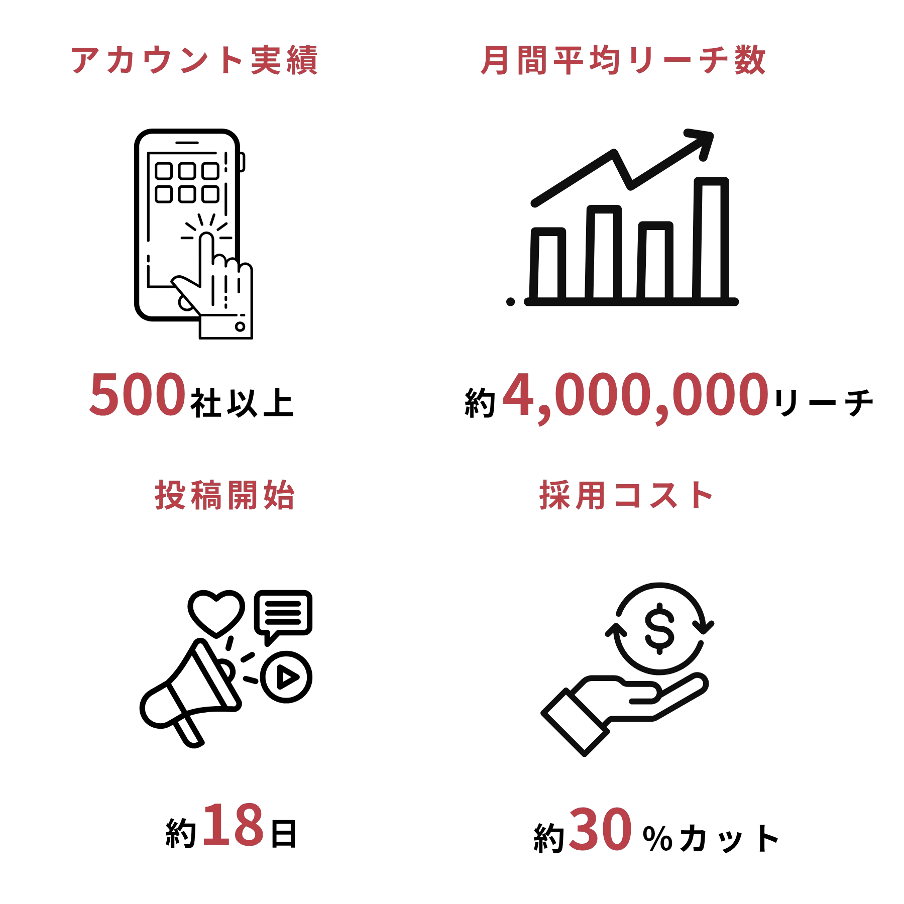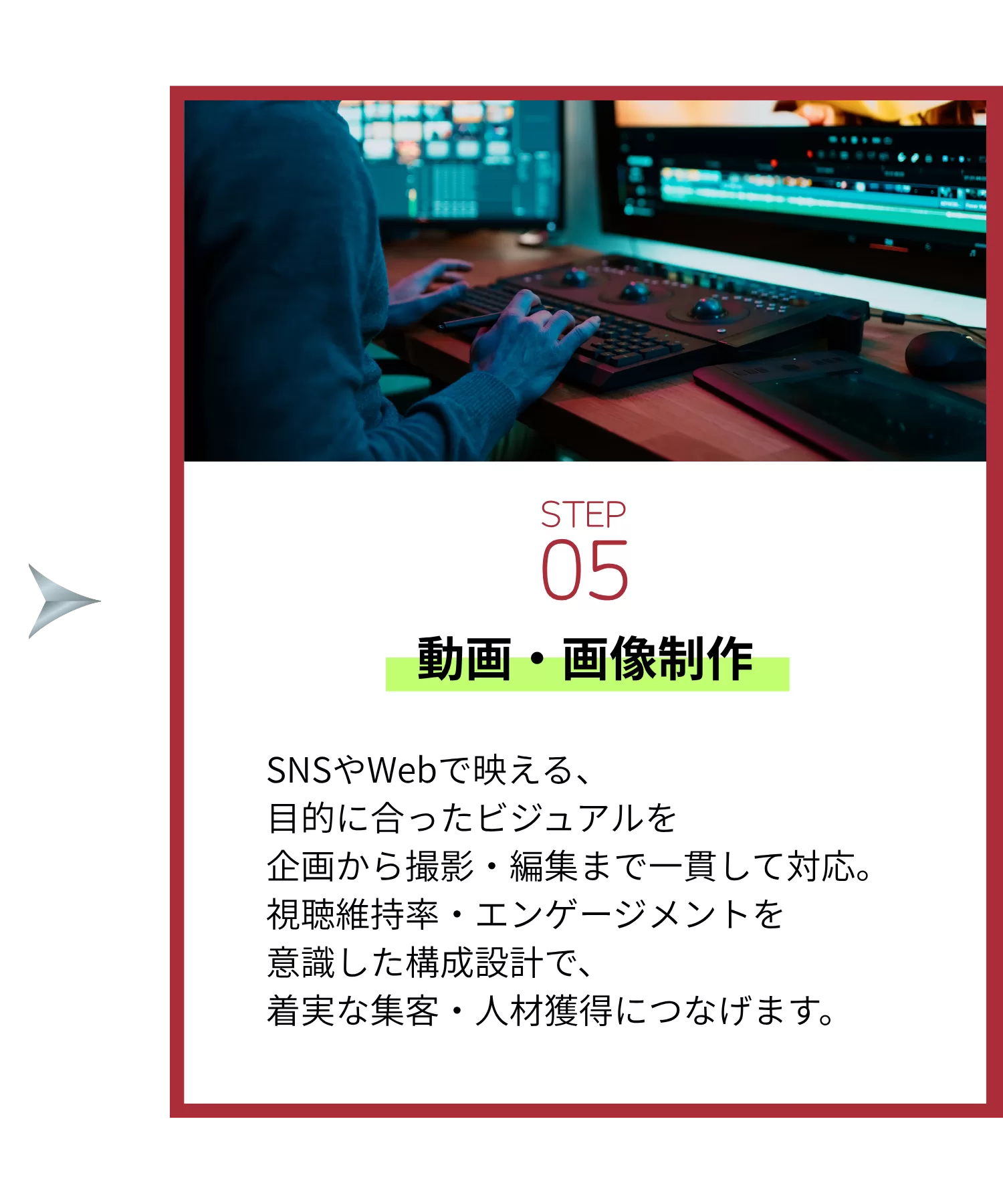 SNS運用500アカウント以上・映像制作5,000件以上の実績をもとに、「魅せる採用ブランディング」と「成果に直結する戦略設計」をご提案。