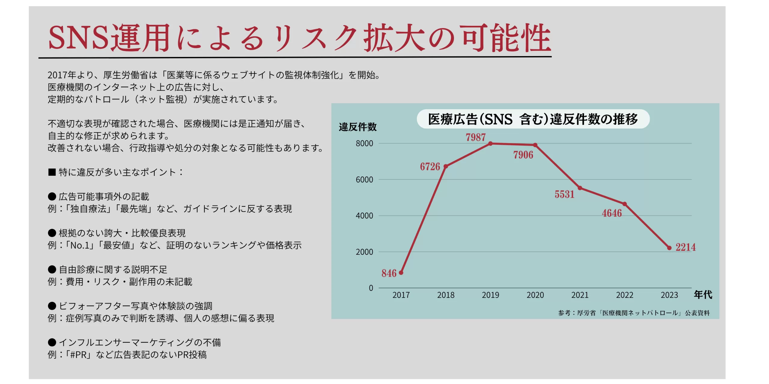 医療業界におけるSNS活用では、「誇大表現」や「不適切な広告表現」が厚生労働省により厳しく規制されています。