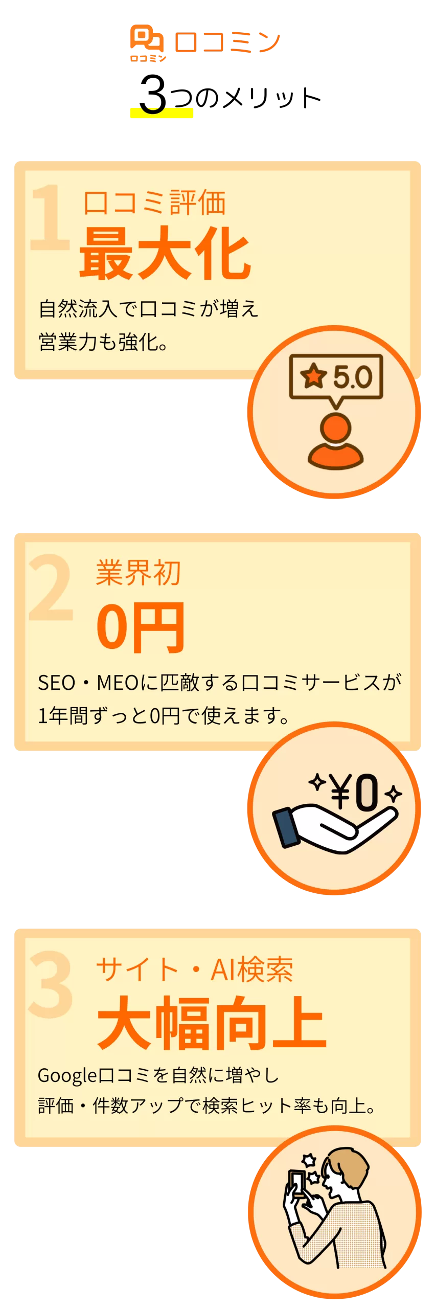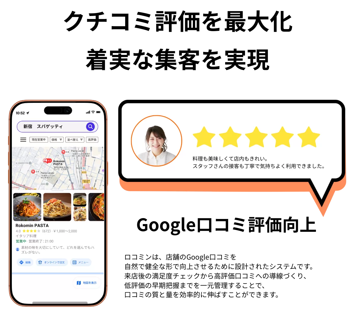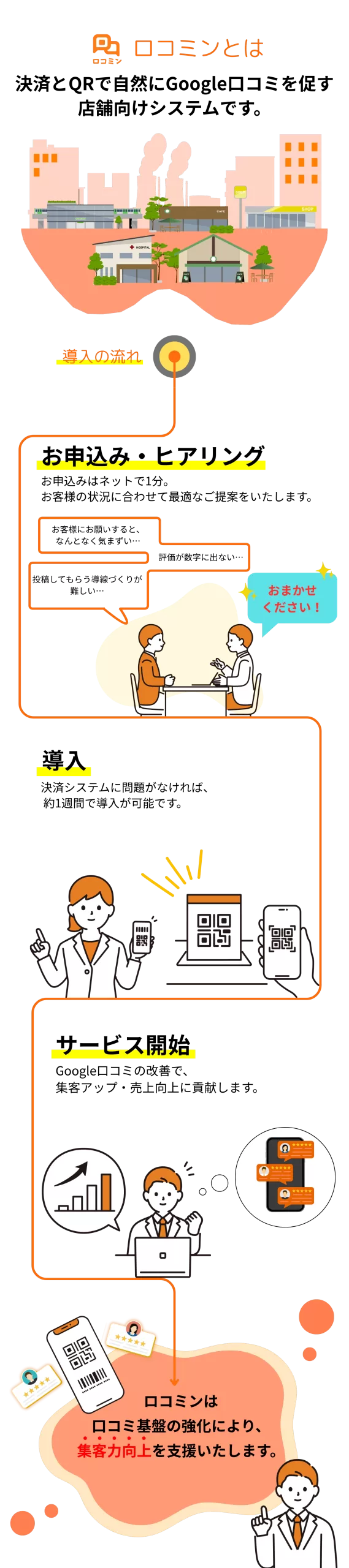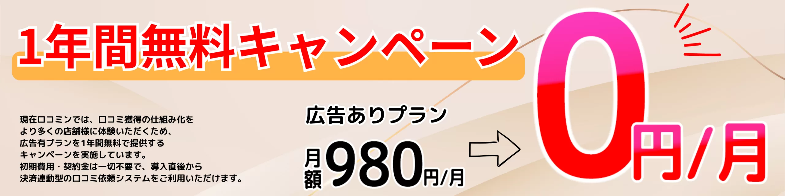 ロコミン 具体的な活用事例 QロコミンはGoogleポリシー違反ではありませんか?A クチコミを依頼すること自体は違反ではありません。ただし、報酬を条件に高評価を求める行為や、虚偽の内容を誘導する行為は明確なポリシー違反です。当社の仕組みでは、ポリシーを遵守した安全な誘導設計を行っています。 Q導入している決済システムは何ですか?A 現在、Square・PayPay・Stripe を導入しております。そのほかの決済システムについても、随時追加・導入が可能ですので、お気軽にご相談ください。 Q決済システムなしで導入は出来ますか?A はい、問題ございません。現金のみで営業されている場合でも、決済システムをお持ちでなくても導入いただけます。 Qクチコミ投稿はどのタイミングが効果的ですか?A 平均的には、1〜2ヶ月ほどで検索順位の変化や来店数への影響が見え始めるケースが多く見られます。ただし、効果を安定的に高めていくためには、継続的にクチコミを獲得し続けることが重要です。 Qクチコミ投稿後に特典を渡すのはNGですか?A 「特典と引き換えに高評価を要求する」行為はGoogleのポリシーで禁止されていますが、口コミ投稿そのものに対して特典を提供することは問題ありません。ただし、特典の条件設定やお客様への案内方法には細心の注意が必要です。 当社では、Googleのポリシーに準拠した適切な運用設計をご提案しております。 Q何故無料なんですか?A 現在ロコミンでは、口コミ獲得の仕組み化をより多くの店舗様に体験いただくため、広告ありプランを1年間無料でご提供するキャンペーンを実施しております。 また、本来月額980円のプランは、画面内に広告が表示される仕様のため、他社サービスと比較しても非常に低コストでご利用いただける内容となっております。 お問い合わせ