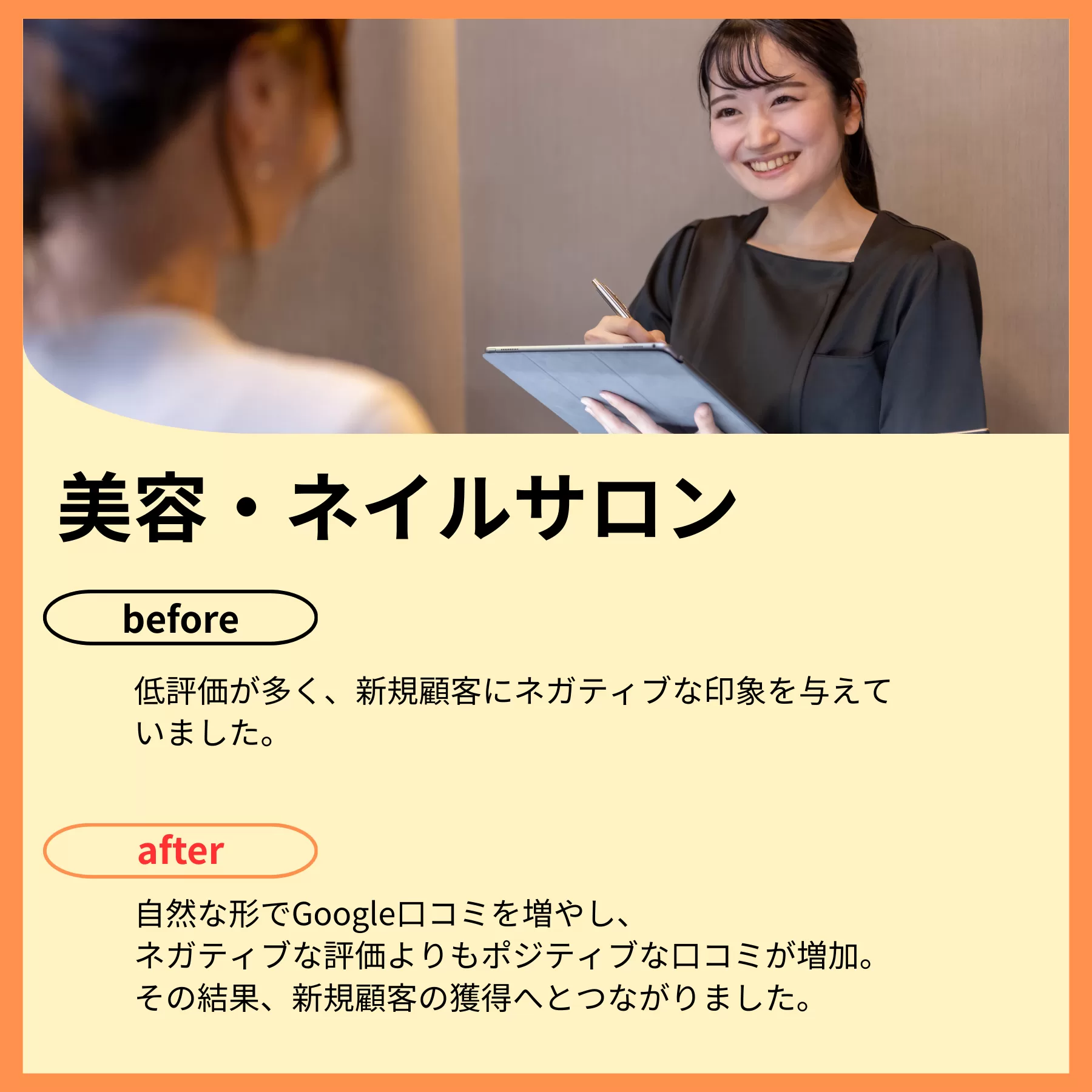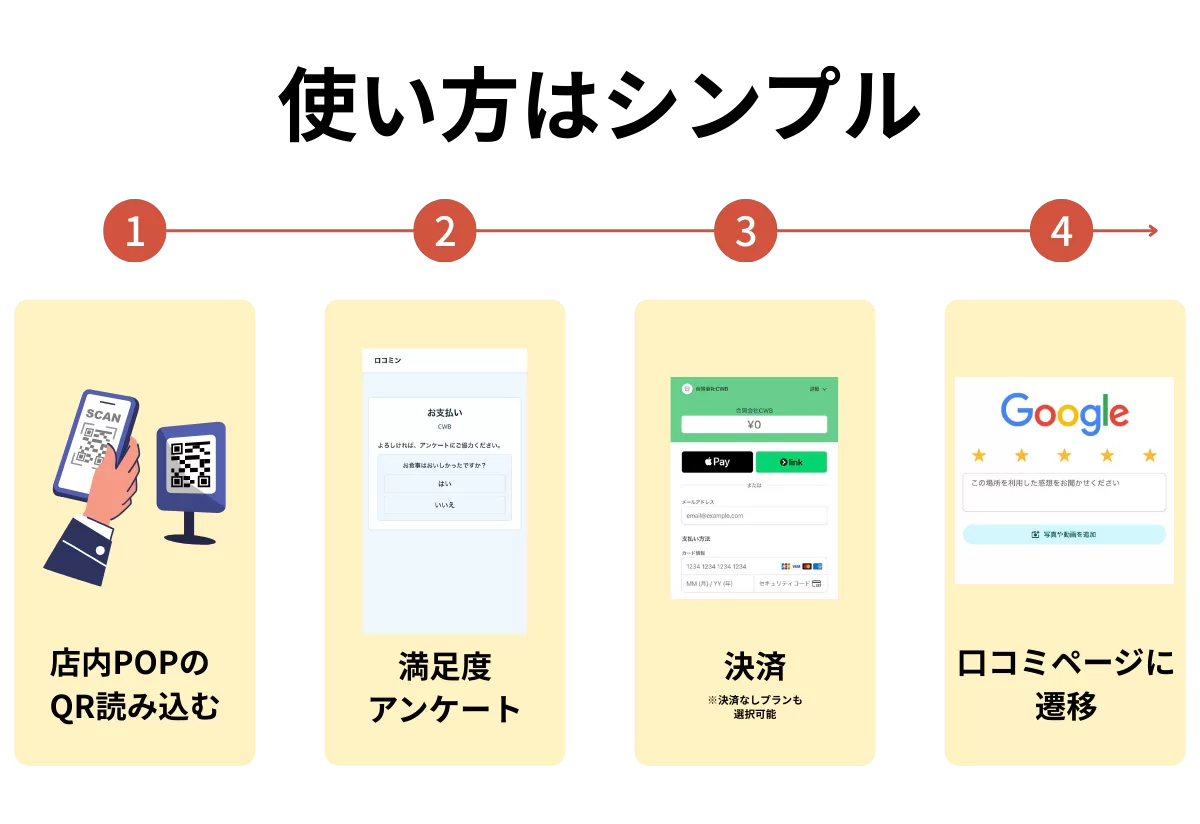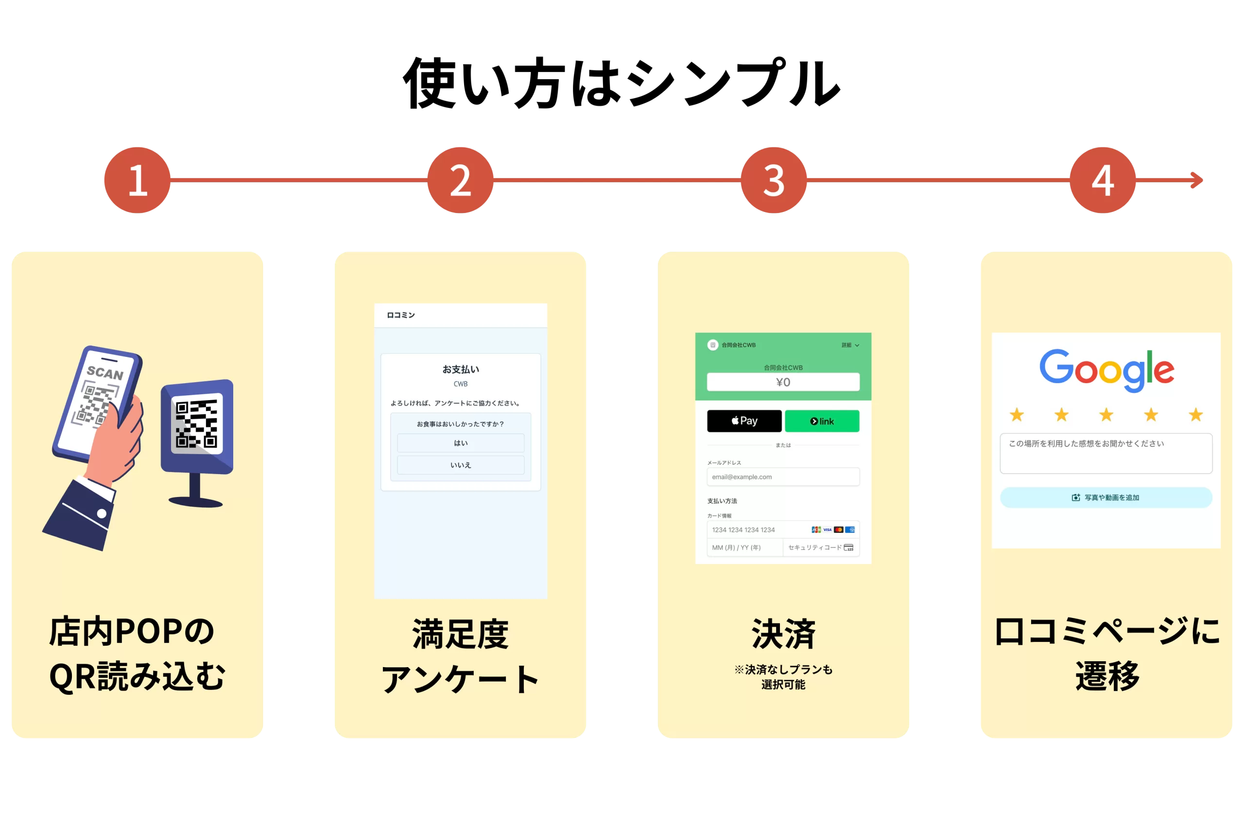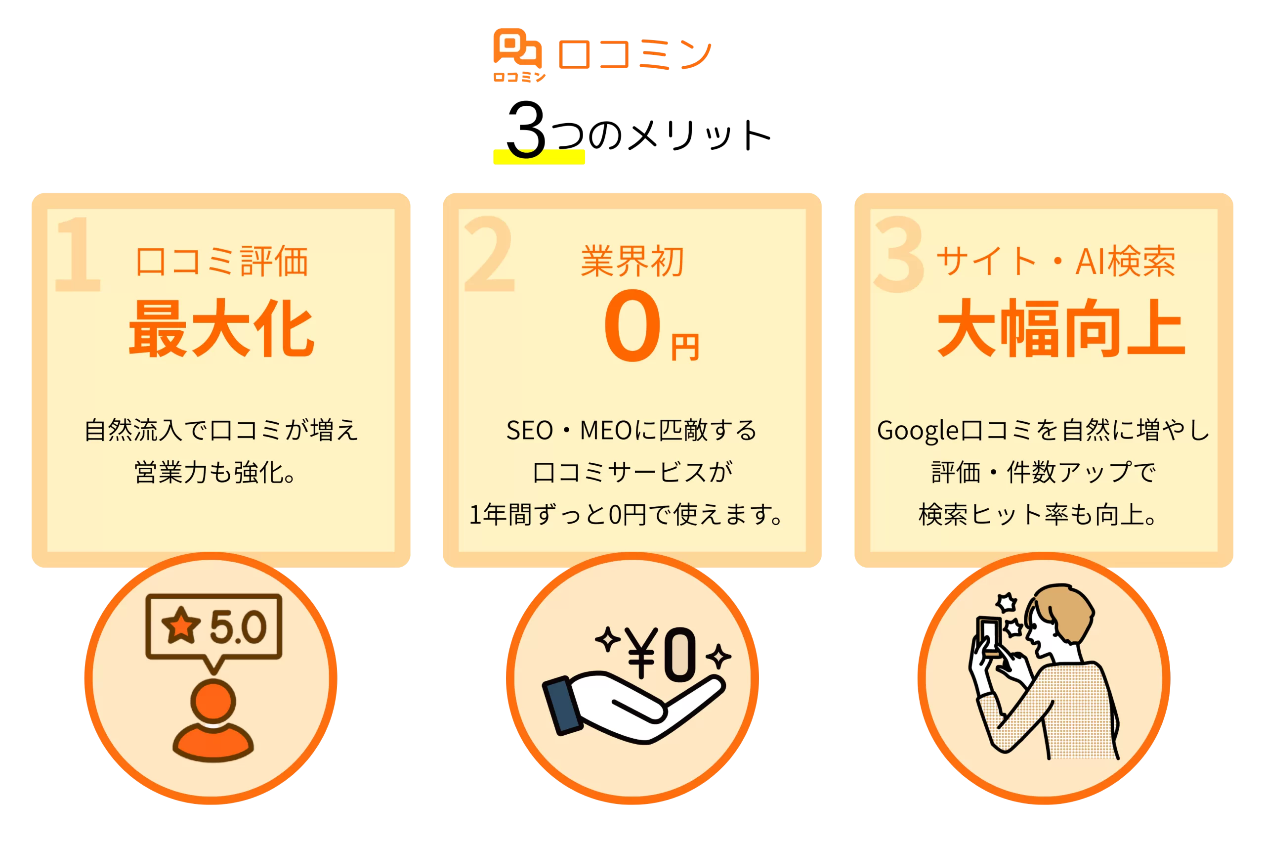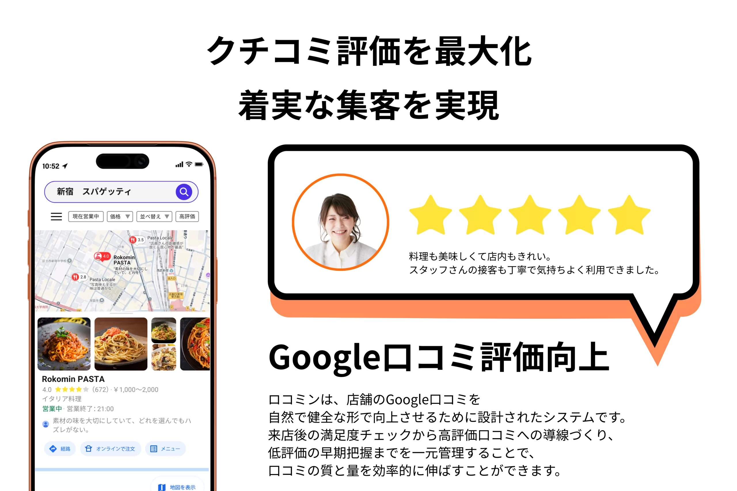 ロコミン 具体的な活用事例 QロコミンはGoogleポリシー違反ではありませんか?A クチコミを依頼すること自体は違反ではありません。ただし、報酬を条件に高評価を求める行為や、虚偽の内容を誘導する行為は明確なポリシー違反です。当社の仕組みでは、ポリシーを遵守した安全な誘導設計を行っています。 Q導入している決済システムは何ですか?A 現在、Square・PayPay・Stripe を導入しております。そのほかの決済システムについても、随時追加・導入が可能ですので、お気軽にご相談ください。 Q決済システムなしで導入は出来ますか?A はい、問題ございません。現金のみで営業されている場合でも、決済システムをお持ちでなくても導入いただけます。 Qクチコミ投稿はどのタイミングが効果的ですか?A 平均的には、1〜2ヶ月ほどで検索順位の変化や来店数への影響が見え始めるケースが多く見られます。ただし、効果を安定的に高めていくためには、継続的にクチコミを獲得し続けることが重要です。 Qクチコミ投稿後に特典を渡すのはNGですか?A 「特典と引き換えに高評価を要求する」行為はGoogleのポリシーで禁止されていますが、口コミ投稿そのものに対して特典を提供することは問題ありません。ただし、特典の条件設定やお客様への案内方法には細心の注意が必要です。 当社では、Googleのポリシーに準拠した適切な運用設計をご提案しております。 Q何故無料なんですか?A 現在ロコミンでは、口コミ獲得の仕組み化をより多くの店舗様に体験いただくため、広告ありプランを1年間無料でご提供するキャンペーンを実施しております。 また、本来月額980円のプランは、画面内に広告が表示される仕様のため、他社サービスと比較しても非常に低コストでご利用いただける内容となっております。 お問い合わせ