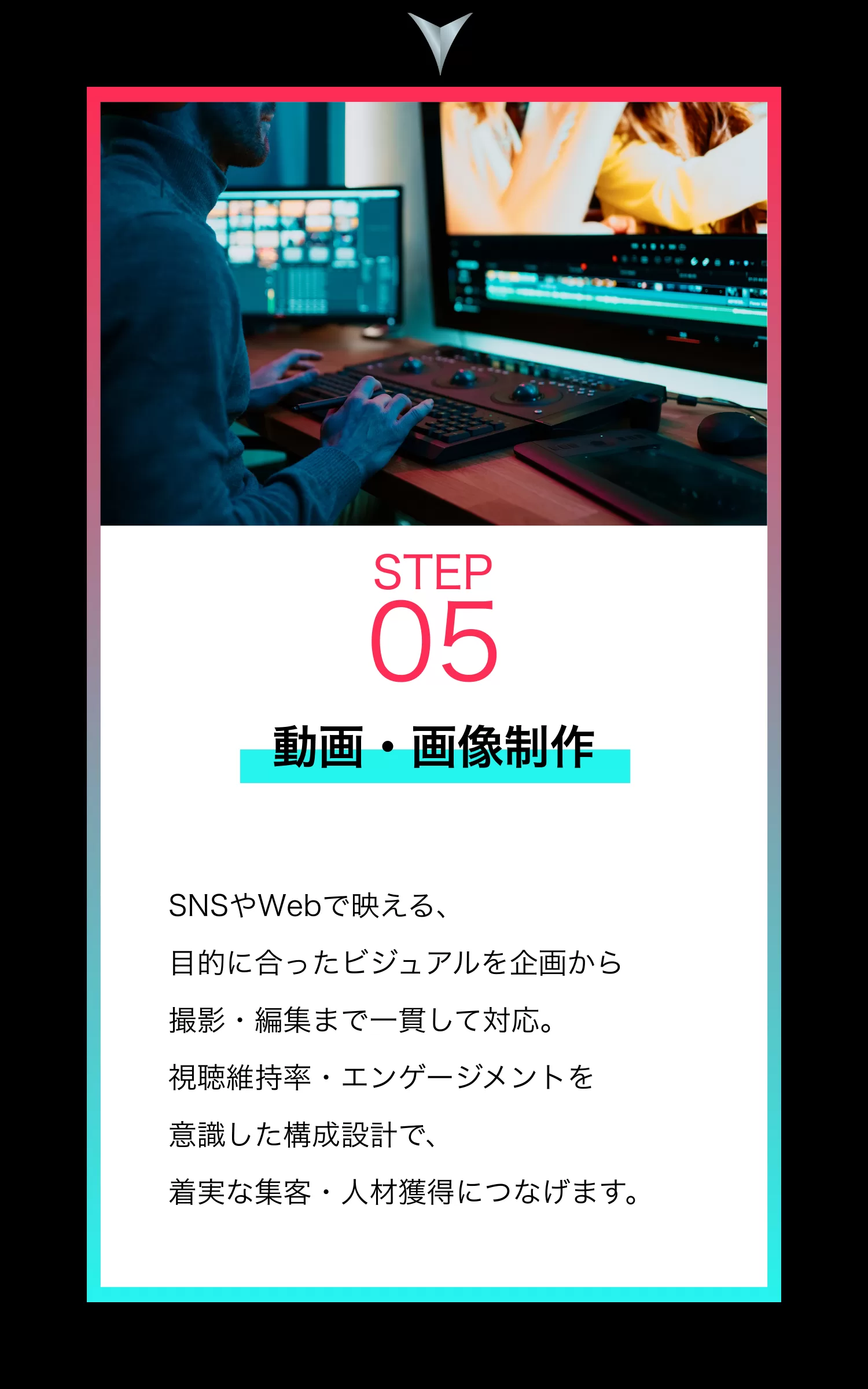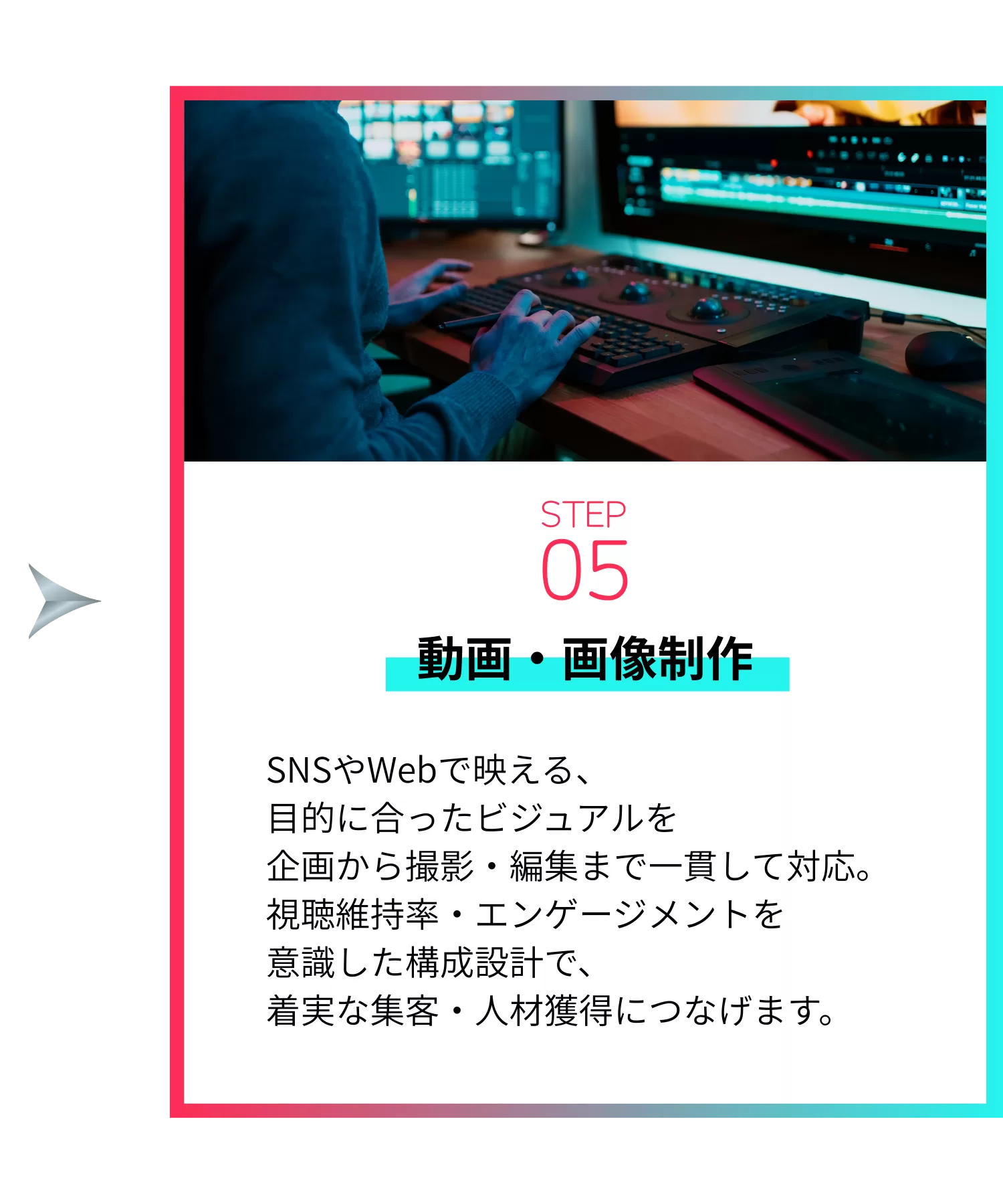 SNS運用500アカウント以上・映像制作5,000件以上の実績から「表現力」と「戦略力」で、プロならではの視点から最適なご提案を行います。